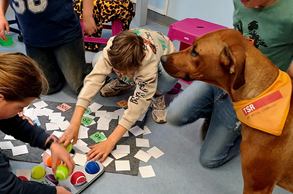 Wir üben einfaches Zusammenrechnen im Zehnerbereich. Lou hat für die Kinder die Zahlen apportiert.